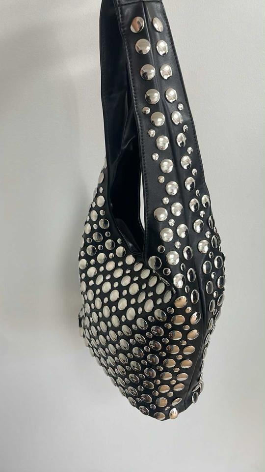 Sac épaule en simili cuir noir, décoré de clous argentés pour un look rock et moderne. Chic et pratique au quotidien.